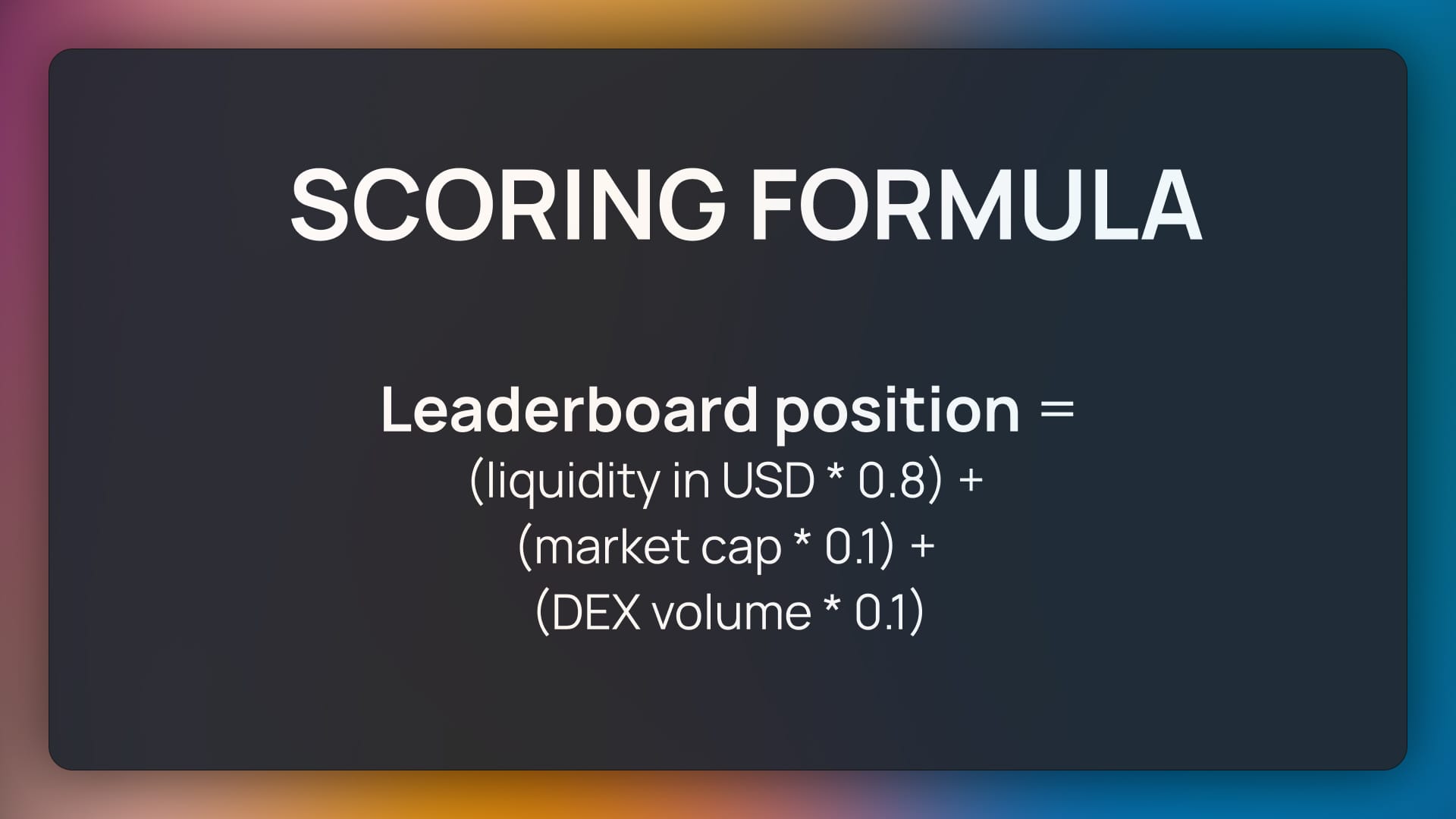 Leaderboard positions are based on liquidity, market cap, and DEX volume using this formula: