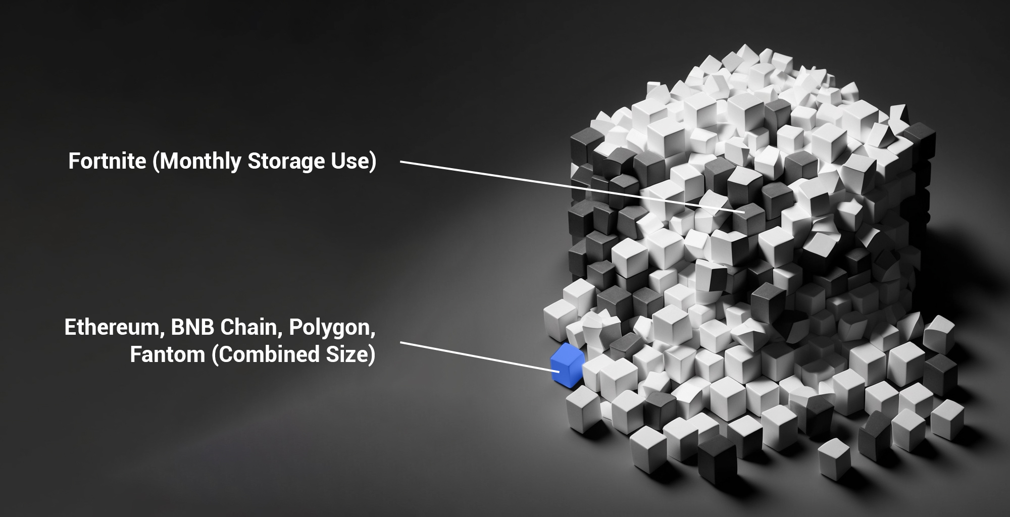 Every month, Epic Games deals with 2,000 terabytes of data to keep Fortnite running. In other words, around 300x the entire storage used by Ethereum, BNB Chain, Polygon, and Fantom combined.
