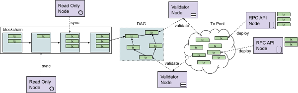 Nodes can have different roles: RPC API nodes can issue new transactions and place them in a transaction pool.