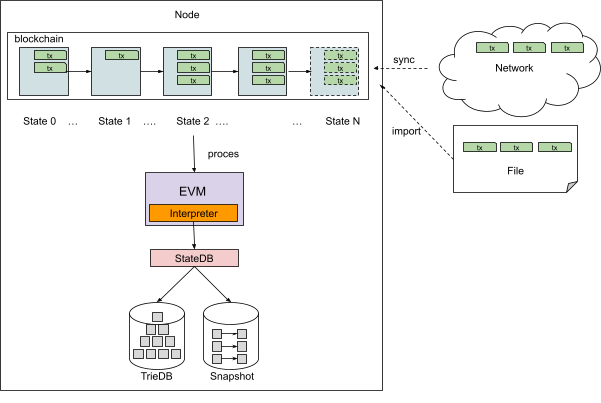 Every node contains its copy of the ledger updated from the incoming network events (either by file or via the internet connection). The ledger’s state is updated as the node executes the transactions in every block. The ledger is changed by modifying Accounts or Smart Contracts Storage (StateDB). The account holds a fixed record of balance, nonce, and the smart contract code with the link to its storage. The smart contracts are executed on the EVM virtual machine. They may modify the Accounts and the Storage. Note that the ledger can keep several database versions throughout the state evolution while executing transactions using a Merkel Patricia Trie data structure.