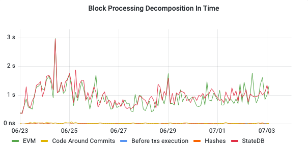 We see that the workload of the EVM virtual machine and StateDB are highly correlated, and other components of block processing do not exhibit workload spikes. The timeline graph gives us high confidence that the StateDB and EVM components are the main targets for performance engineering; other components do not require immediate optimizations. Furthermore, we cannot see any slow-down trends in the timeline graph.