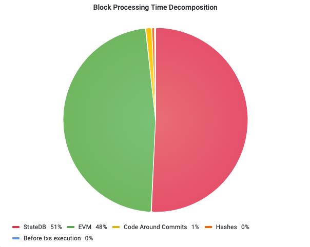 As shown in the chart, the runtime of block processing is dominated by the StateDB (51% of the total runtime) and the EVM virtual machine (47% of the total runtime).