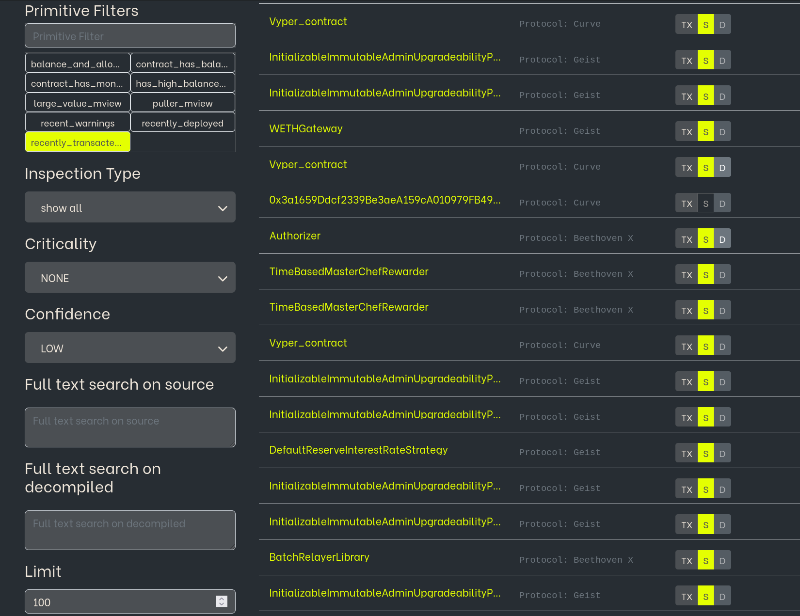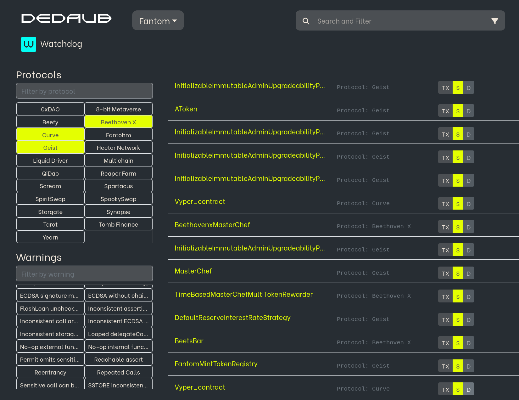 Dedaub’s flagship product is built on Contract Library. Watchdog is an automated, continuous auditing system that analyzes selected smart contracts from the Fantom Network. Any flagged warning is examined by a human auditor and escalated if judged to be valid and high-value.