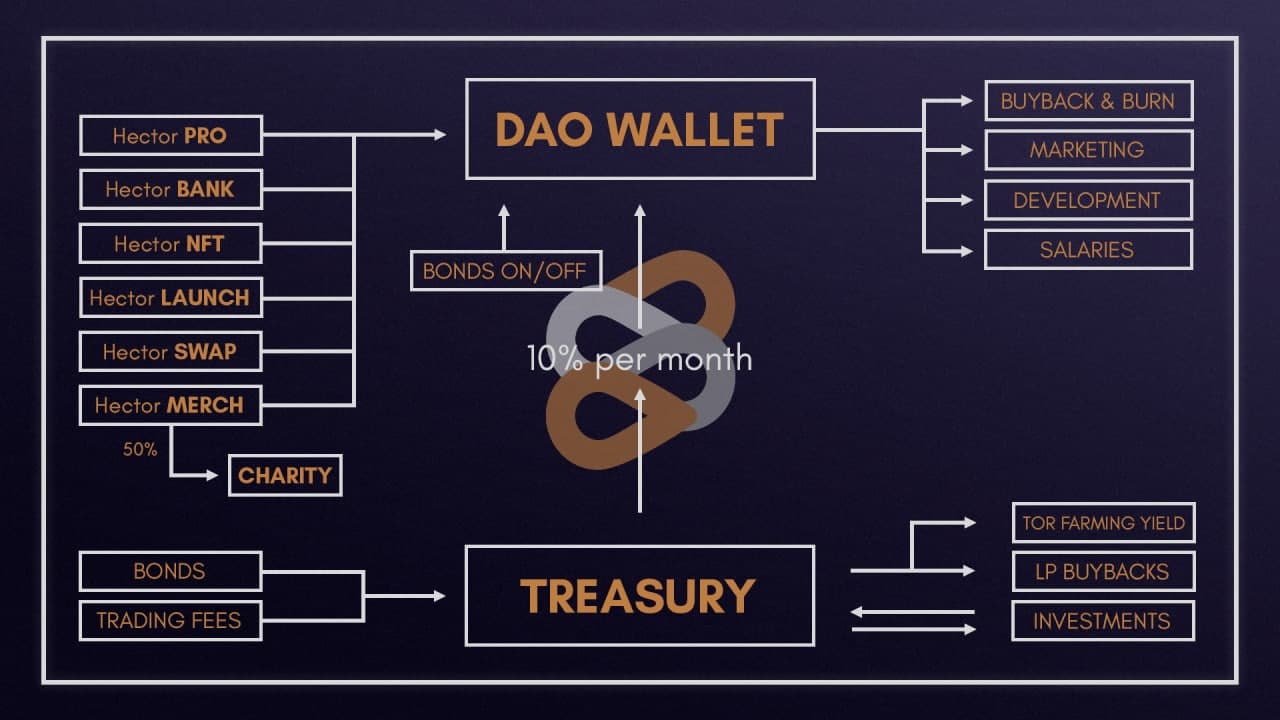 Hector Finance is the world’s first deflationary rebase project. This is achieved through the Treasury, DAO Wallet, and its native stablecoin, TOR.