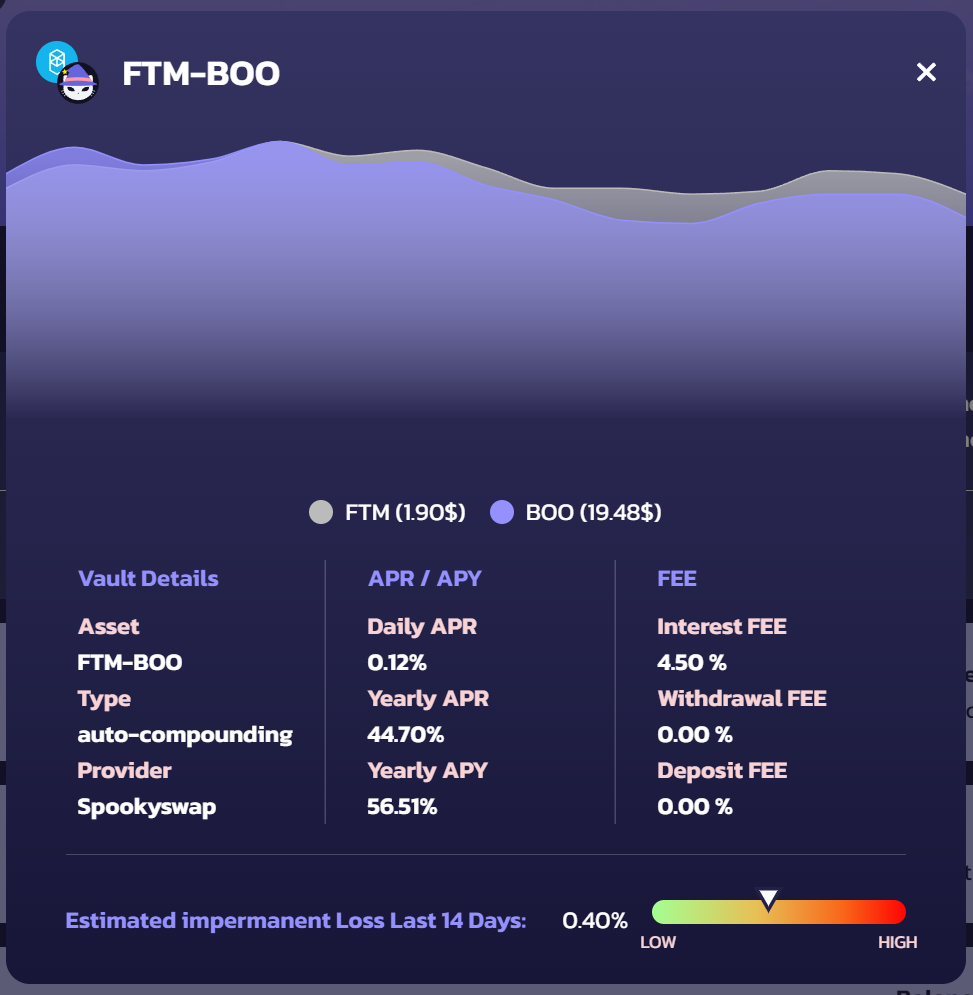 In addition to this, when users click on the “more info” button to the right of every vault, the platform delivers estimated, trailing 14-day Impermanent Loss (IL) statistics along with the standard APR/APY and fee details.