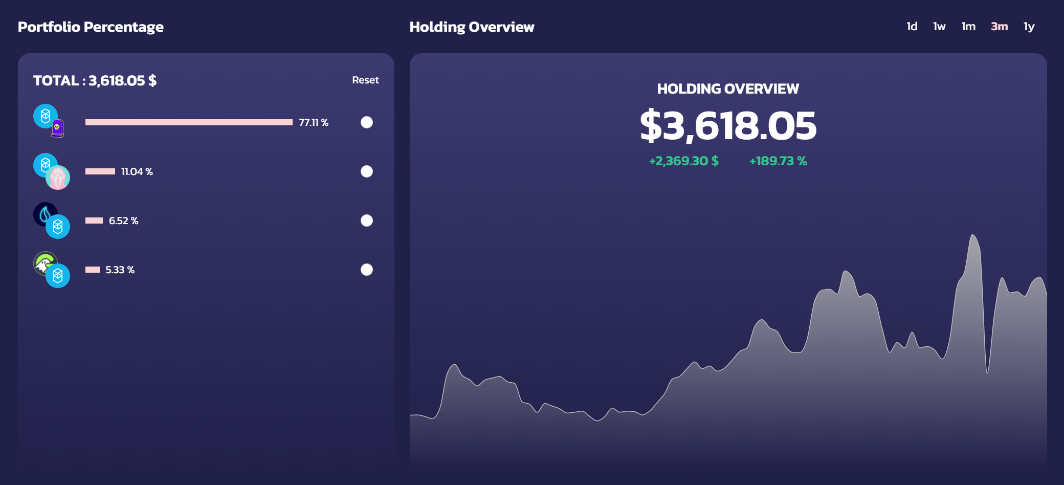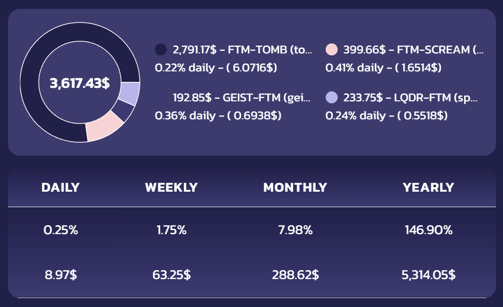 Users can graphically monitor the daily, weekly, monthly, and yearly performance of their personal portfolio, while also tracking how many LP tokens they have for each pair.