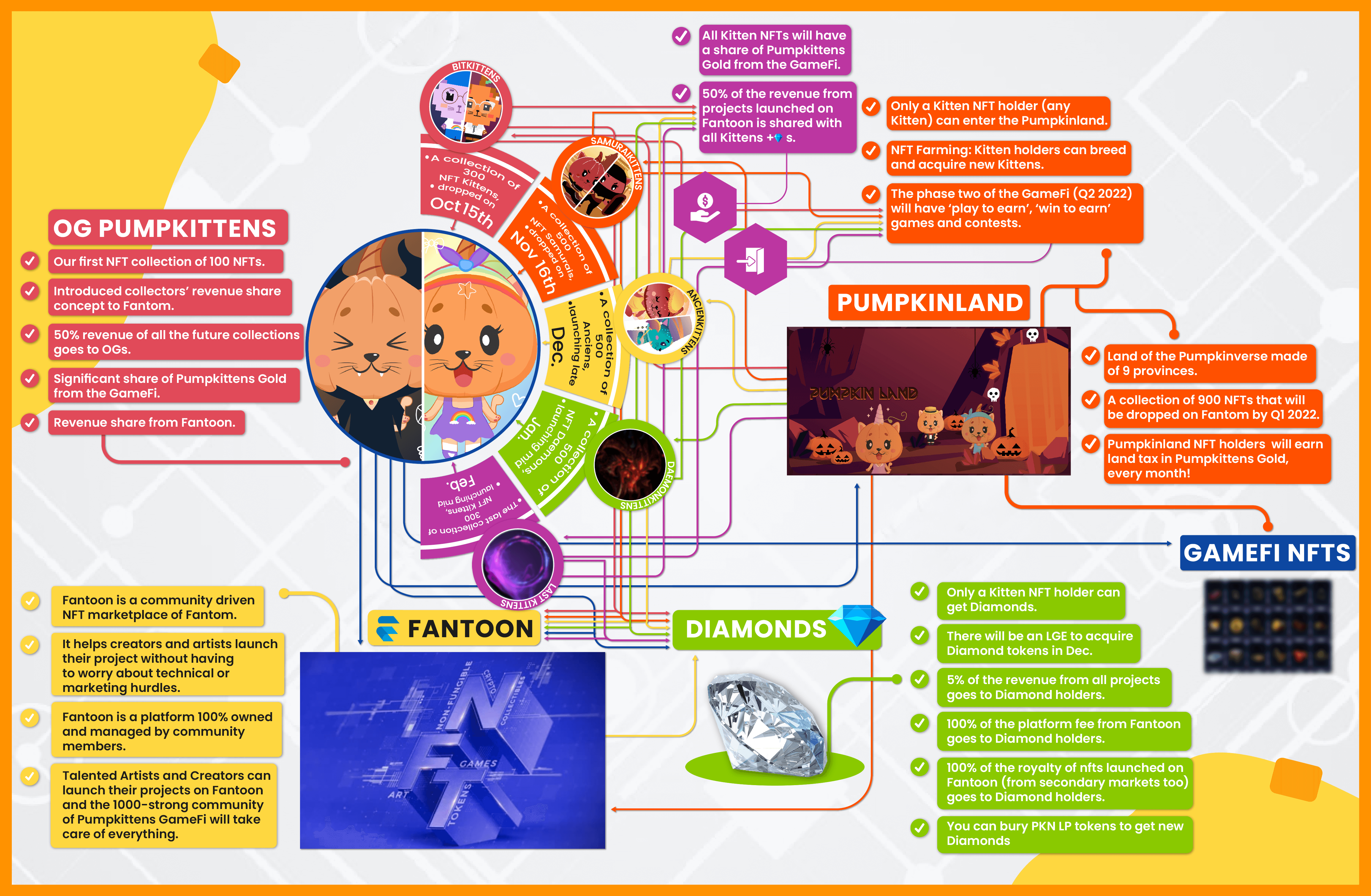50% of all revenue goes to the collectors of OG Pumpkittens. Not just that, all NFT Kittens will have earning potential in the GameFi platform ‒ there will be NFT farming, breed-to-earn, win-to-earn, and play-to-earn DeFi strategies.
