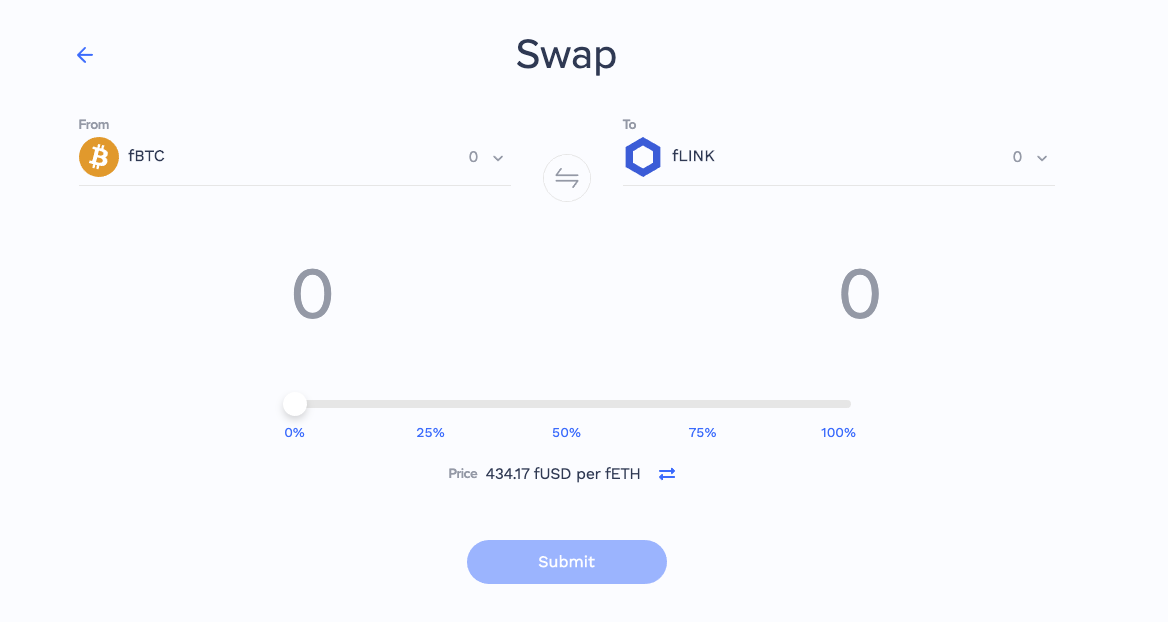 We adopted a similar approach to Uniswap, and we created fSwap (previously known as fTrade). Unlike Uniswap, where users trade real tokens, on fSwap users will trade synthetic tokens.