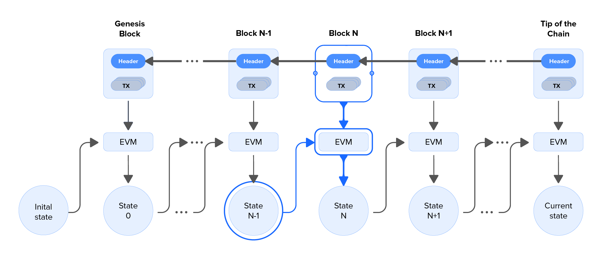 As shown in the above figure, the block processing includes the Ethereum Virtual Machine (EVM) and starts with the genesis block and an initial state. Then, the virtual machine evolves a new state from the next transaction and the old state. The final state of a block is handed over to the next block. The transactions in the N-th block require the state N-1 from the previous block.