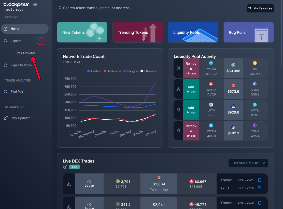 Visit Blockpour and launch the app to arrive at the main screen displaying multi-chain data. Expand the Explore menu on the left-hand side of the screen and click on Pair Explorer.