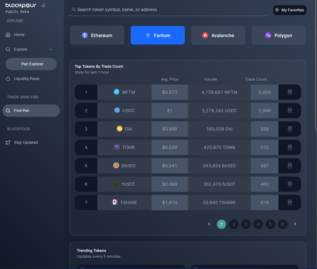 Click on Fantom to drill down. Here, you can see the top tokens by trade volume and heavily traded tokens. The page updates automatically, approximately every five minutes. Clicking on any displayed token will take you to the dedicated token dashboard with more data.