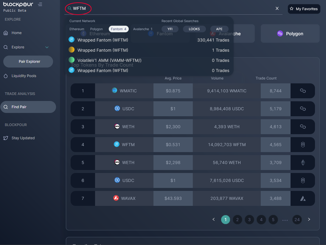 The Pair Explorer page also allows you to search for tokens via the search bar at the top left-hand side of the screen. In this example, we search for WFTM. Note that the displayed search results indicate the chains on which the token is active.