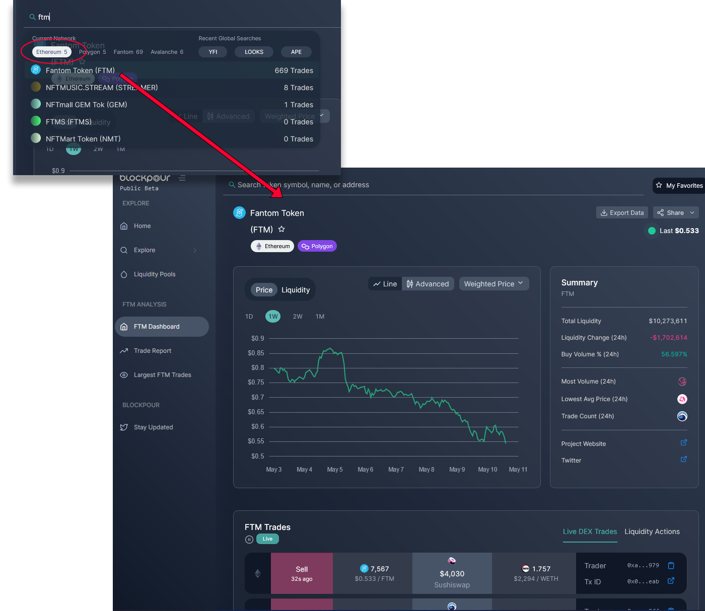 Blockpour tracks multi-chain data, enabling you to explore Fantom tokens and projects on other chains. Let’s look at FTM on the Ethereum network.