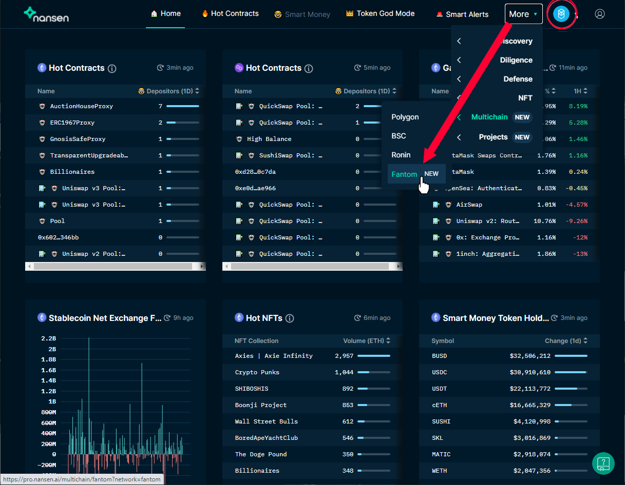 To access high-level ecosystem stats, click on More, Multichain, and then Fantom (note that some options may gray out, as features are being rolled out for newly added chains).