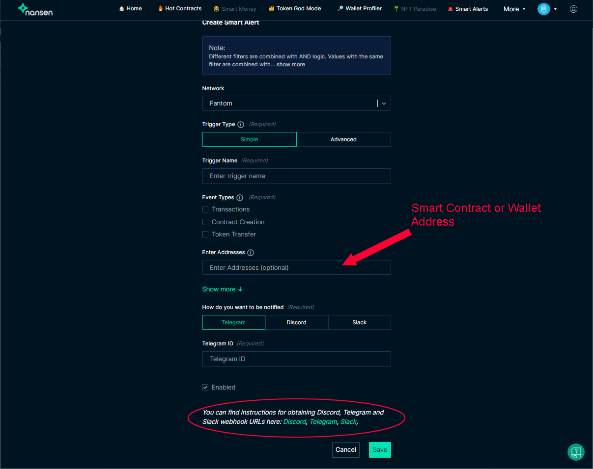 Nansen enables users to create alerts sent to Telegram, Discord, or Slack. To create a Smart Alert, click More, thenDefense in the drop-down menu, and then select Smart Alerts.