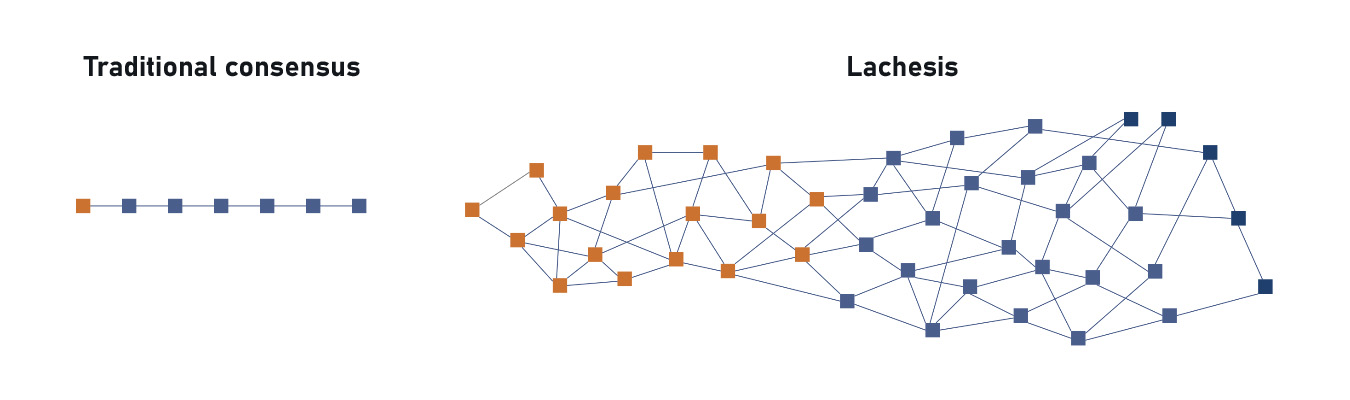 Lachesis is an asynchronous consensus mechanism that validates and confirms transactions faster than traditional mechanisms. In this system, validators confirm transactions on their own and bundle these up in small batches to share with other validators, as opposed to all validators in the network working on confirming the same blocks, like in Bitcoin or Ethereum.