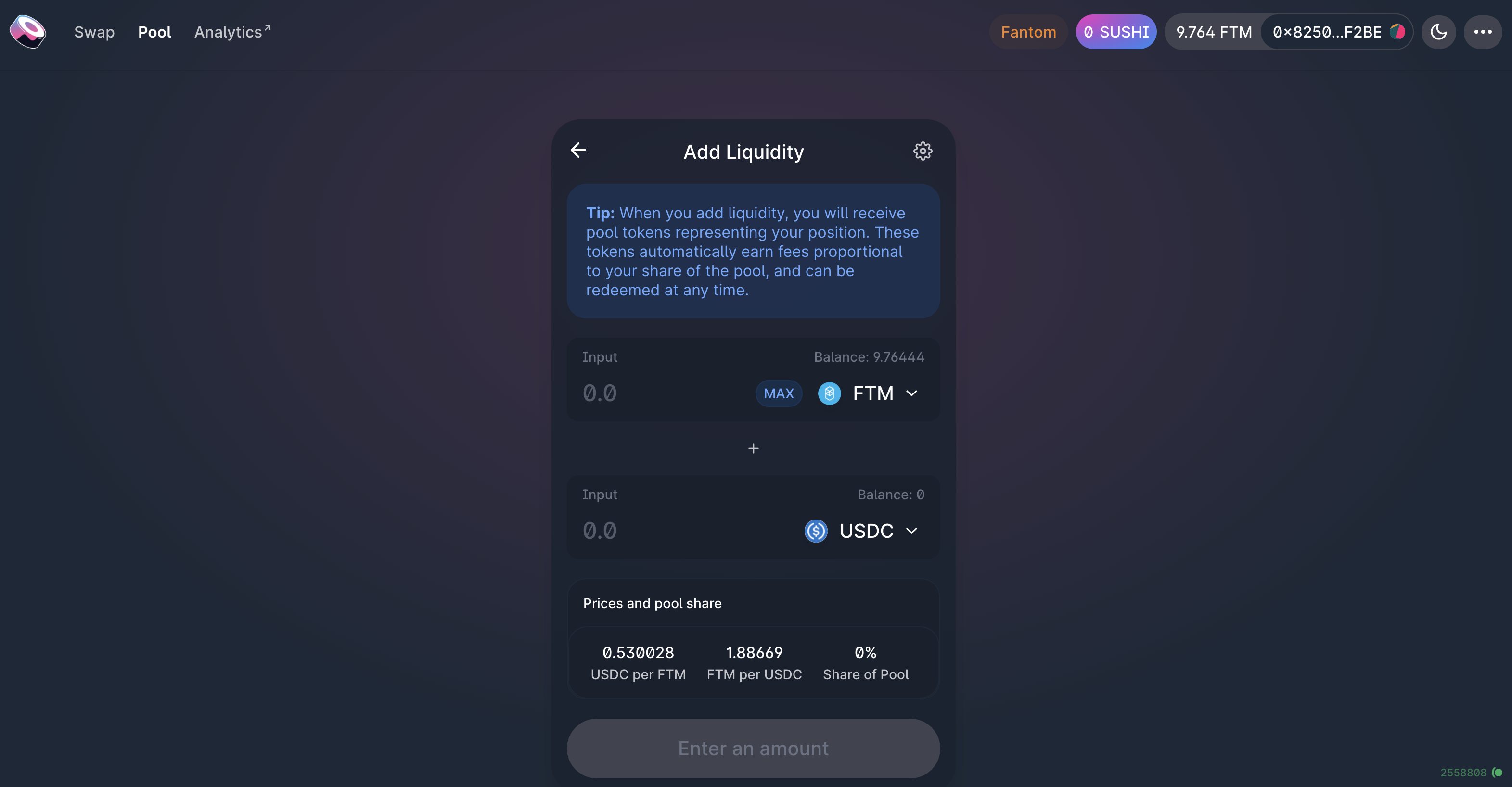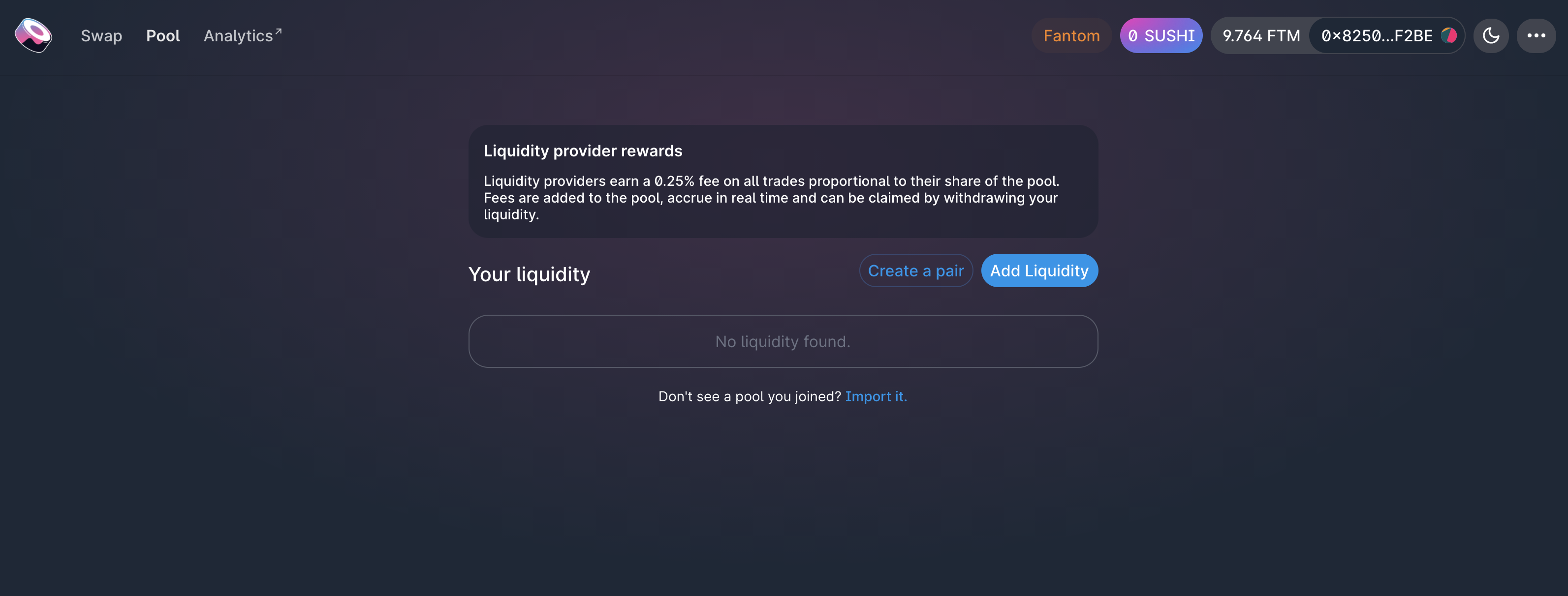 You can add liquidity to SushiSwap on Fantom by selecting Pool on the nav bar. You can then either click on Add liquidity (it will use FTM as one of the tokens of the pair as default), or you can create your own pair.