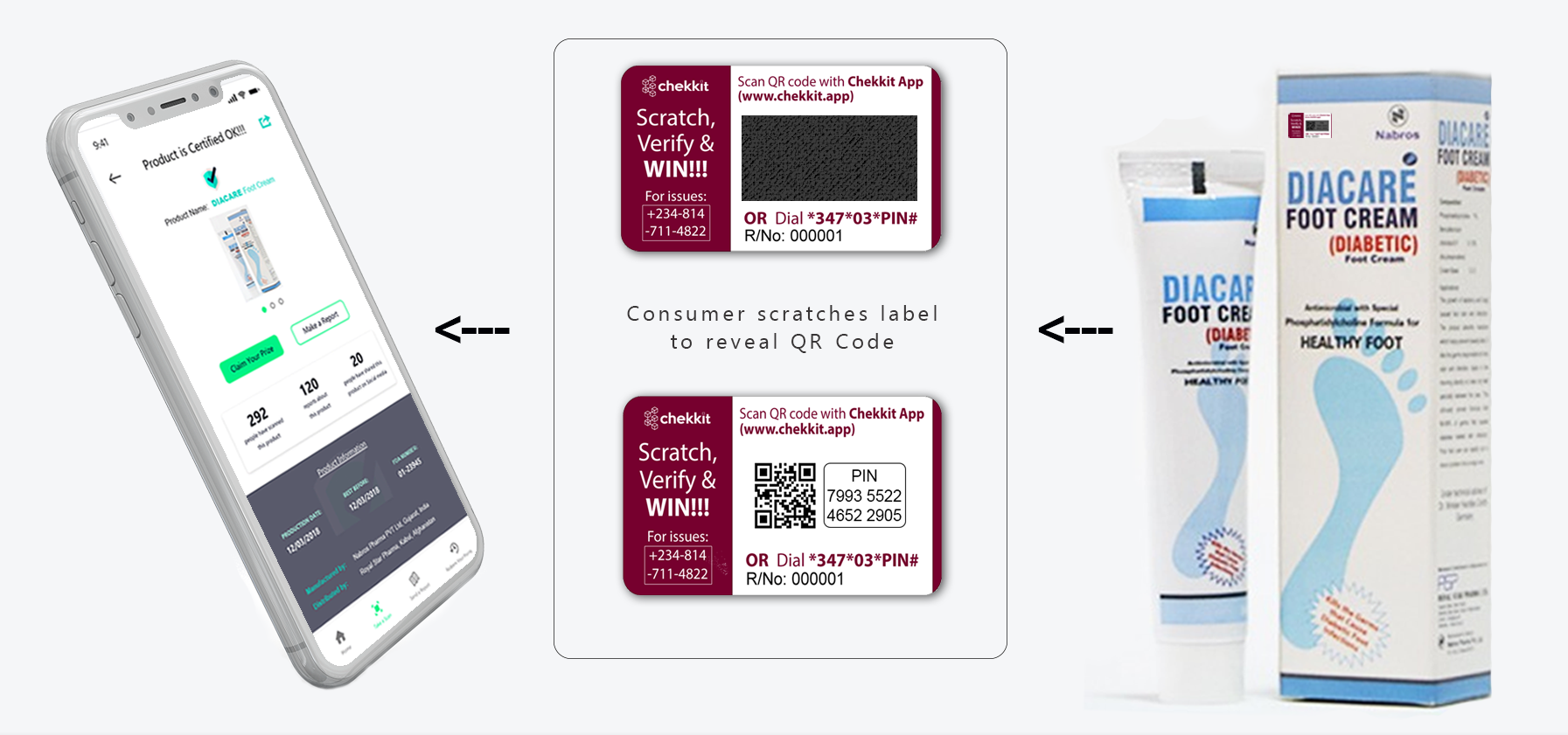- Serialization: The manufacturers of the 80,000 pharmaceutical products will utilize Chekkit's Consumer Intelligence solution where they get access to the unique product IDs (QR codes) that have been generated by the platform and stored on the blockchain network. The IDs are different for every unit and contain information on each product's SKU, production date, expiry date, registration number, and much more. The codes are then supplied as scratch-off sticker labels that then go on the products. The QR codes are hidden by the scratch panel of the label.