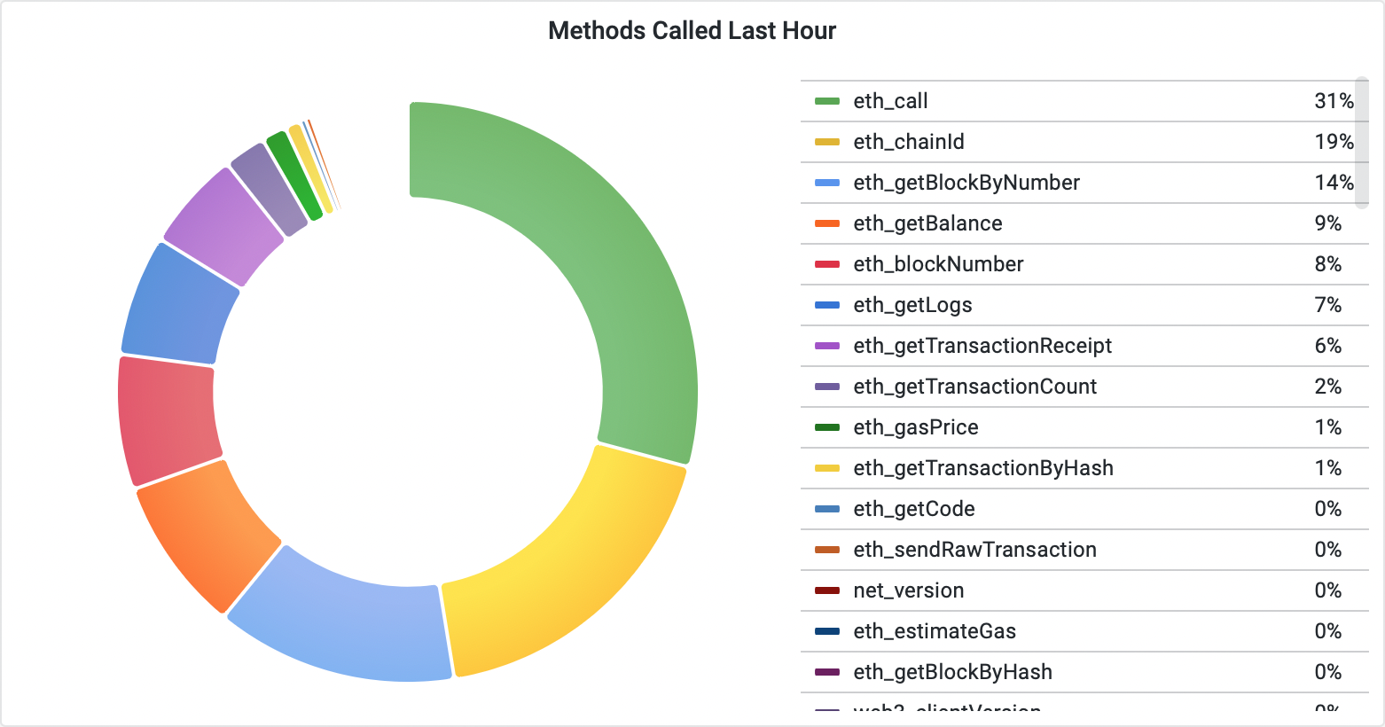 The eth_call requests are executed by about 30% of all the queries processed on the public API interface. This type of request basically allows clients to interact with the smart contracts deployed on the network, and along with the block examination, account balance checks, and emitted events loading represent the majority of resolved client questions.