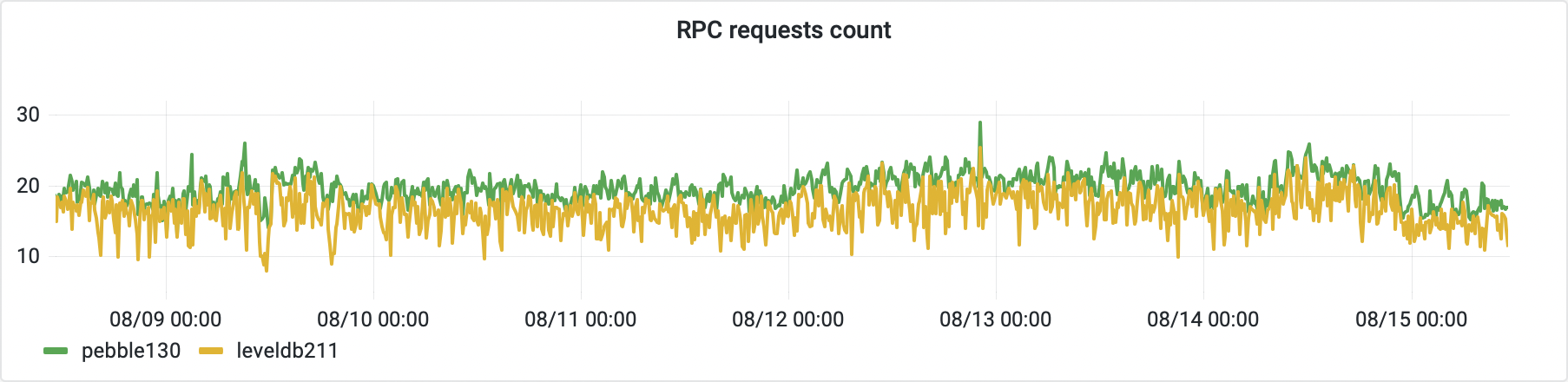 Data points for the following visualisations were extracted on a lower number of parallel request threads. We didn’t want to overload the LevelDB node with requests it couldn’t process. The average number of RPC calls run on both servers fluctuates around 20 req/s. Please note that the PebbleDB node carries out more requests on average than the LevelDB server, and the number of calls finished by it is also less scattered over time.