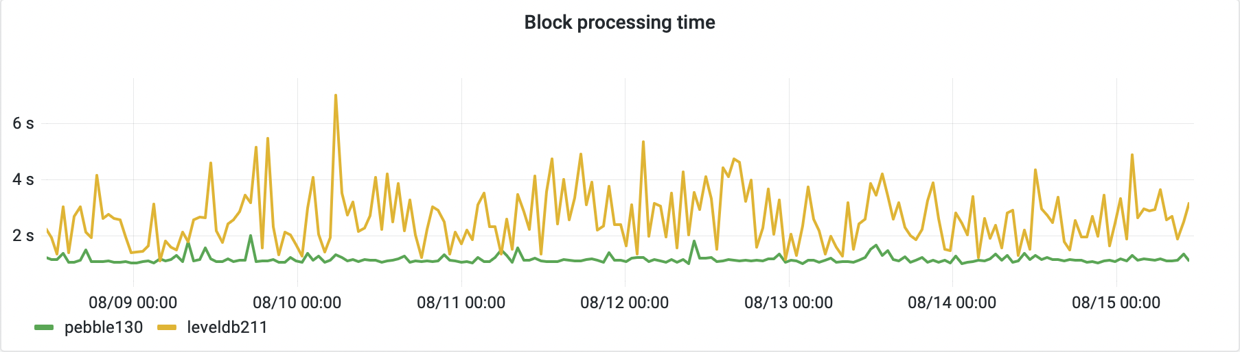 As you can see, the PebbleDB node block insert time is more stable and usually shorter compared to the LevelDB node under the same load.