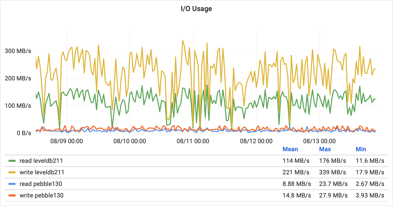 The key benefit we get from the PebbleDB node is expressed in the average I/O, used by the database to exchange data with the persistent storage.
