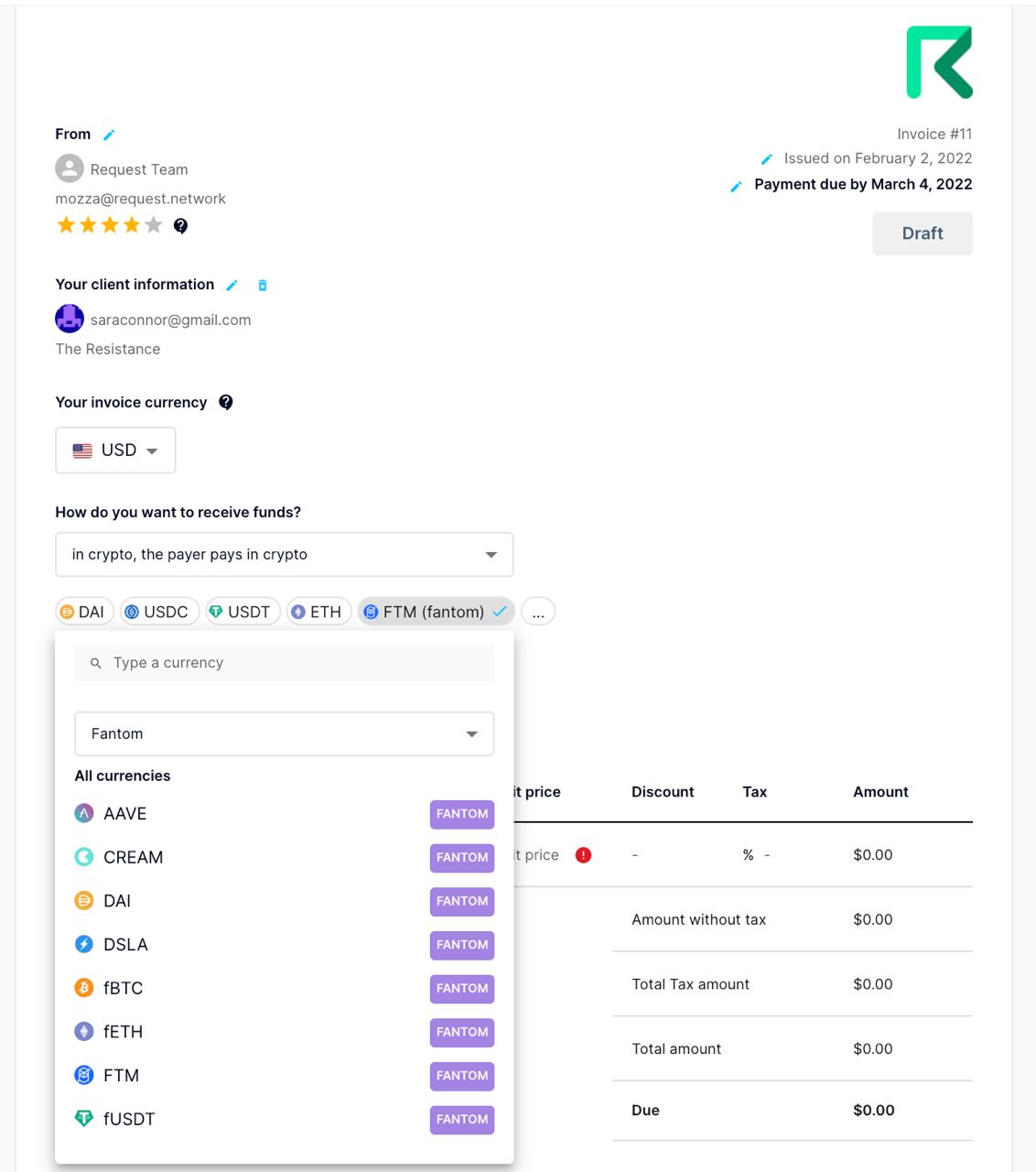 That’s why in August 2021, we announced that Request Finance’s fast and simple app to generate, track, and pay invoices was made available to the rapidly expanding community of users transacting on Fantom.