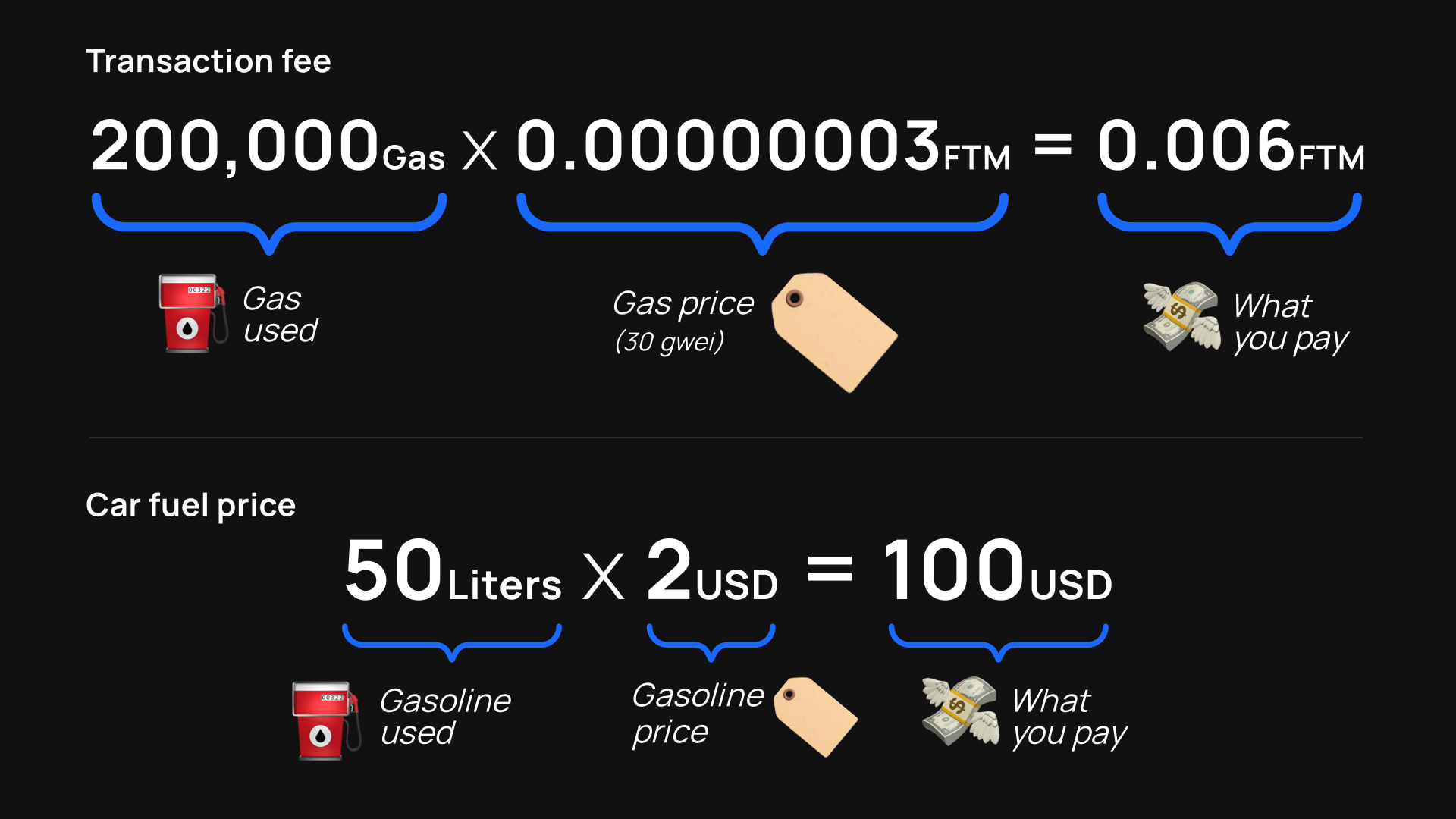 The gas price measures how much you pay for every gas and is usually given in a unit called gwei, which is equivalent to a billionth of an FTM. For example, if a swap transaction takes 200,000 gas to process and the gas price is 30 gwei (0.00000003 FTM) per gas, you multiply these two numbers to get your transaction fee, which is the final price you pay for your transaction, as shown below. Likewise, consider this comparison: if your car needs 50 liters of gasoline to get to its destination and the price of gasoline is 2 USD per liter, the overall cost is found by multiplying these two values.